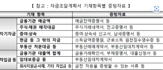 자금조달 계획서 기재 항목별 증빙자료